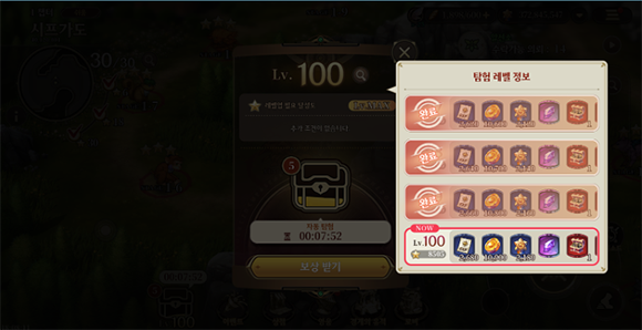 탐험 레벨이 높아질수록 더 많은 보상을 담은 상자를 획득할 수 있으며, 상자는 10분에 하나씩 자동으로 쌓이고, 최대 50개까지 누적됩니다.