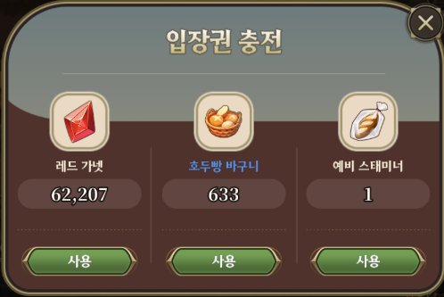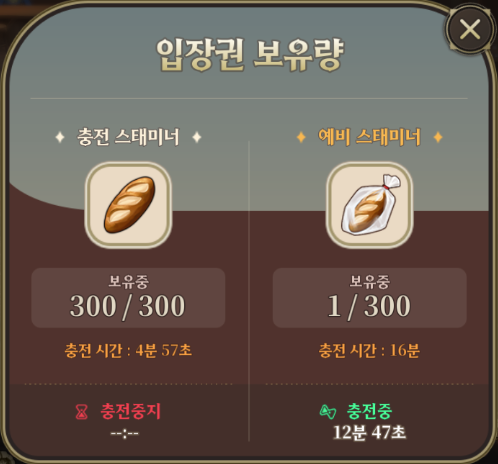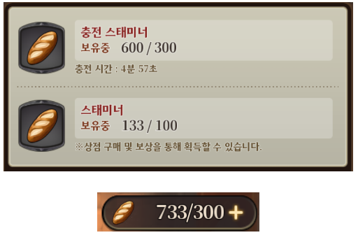 기존 충전 스태미너말고 스태미너로 누적된 빵은 점검 시 빵 바구니로 치환하여 보정 드릴 예정입니다.