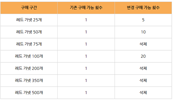 마지막으로, 레드 가넷으로 스태미너를 충전 할 시 구간별 구매 가능 횟수도 다음과 같이 조정됩니다.