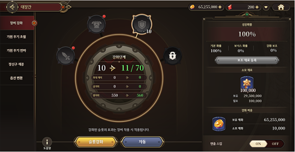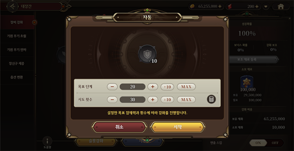 먼저, 원하시는 목표 단계와 최대 시도 횟수를 설정해두면 그 범위 안에서 자동으로 강화를 시도하는 ‘자동 슬롯 강화’ 옵션이 추가됩니다.