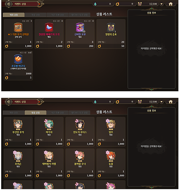 재화 상점, 영웅 상점, 시즌 특별 상점, 월드 보스 도구 상점이 존재합니다.