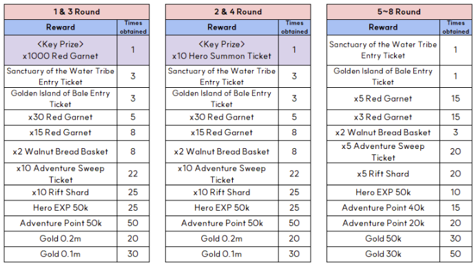 - 抽選は合計 8 ラウンドで構成され、報酬リストは以下のとおりです。