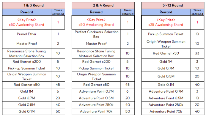 - 各ラウンドは最大200回まで引くことができます。すべての報酬を獲得した場合、またはキー賞品が当選した場合、次のラウンドにリセットされます。