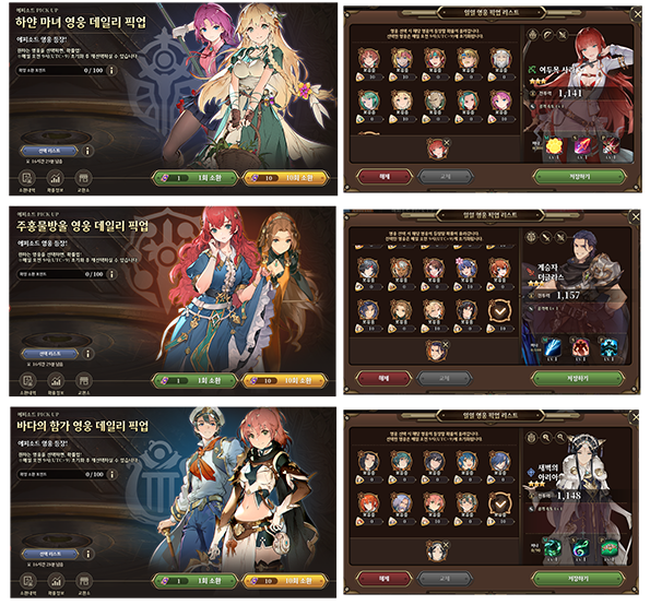 - 매일 1회 선택한 영웅의 소환 확률을 높여 소환할 수 있는 소환 시스템입니다.