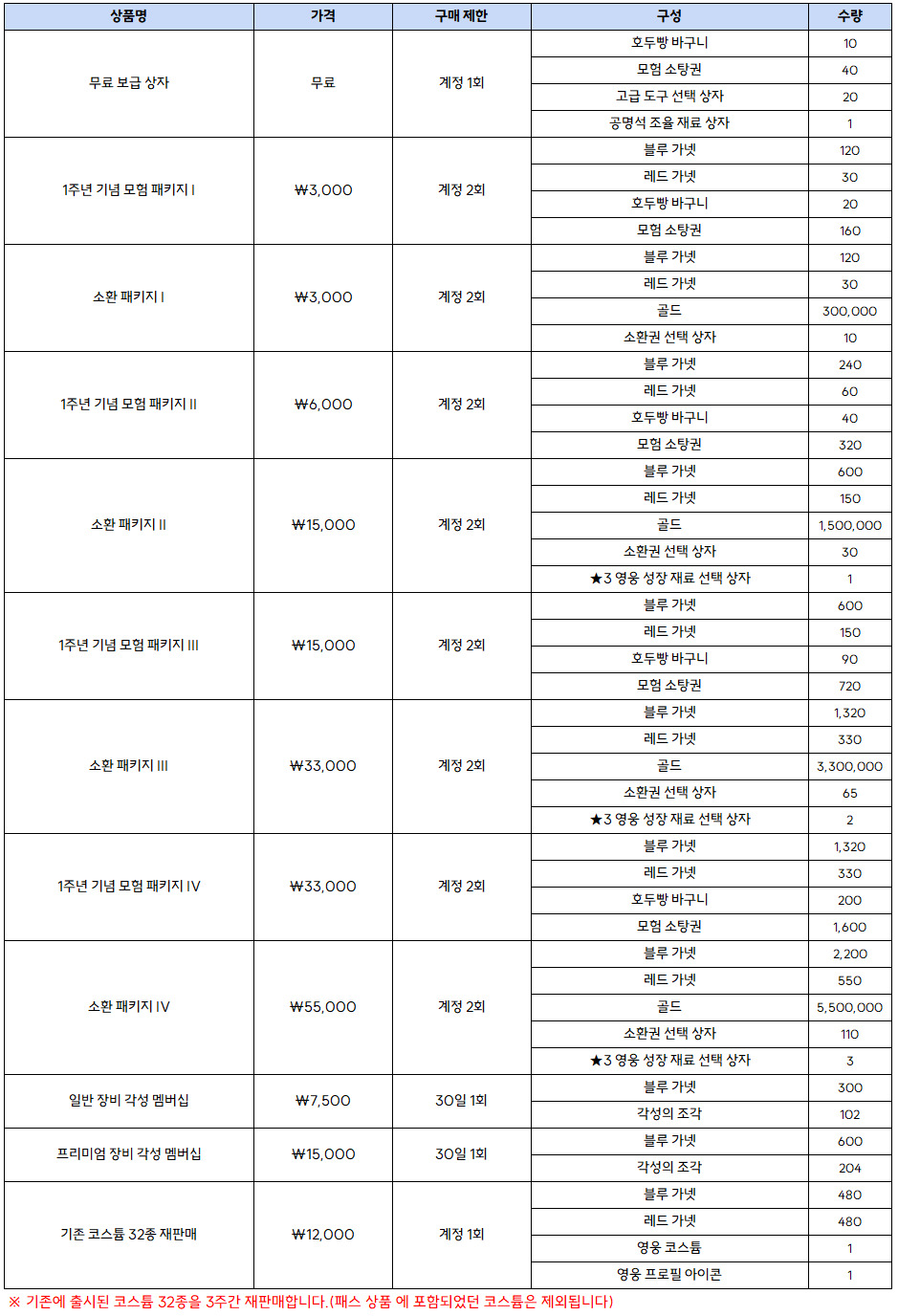 - 1주년 기념으로, 기존에 출시된 코스튬 32종 재판매를 진행합니다.