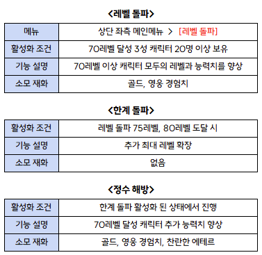 - [레벨 돌파] 시스템은 [레벨 돌파]와 [한계 돌파]&[정수 해방]으로 구성되어 있습니다.