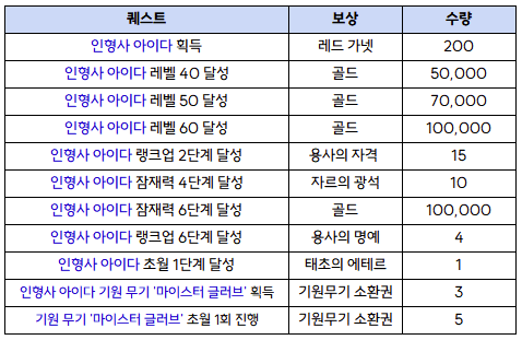 - 인형사 아이다의 획득과 성장을 통해 전투력 상승에 도움이 되는 아이템을 획득할 수 있습니다.