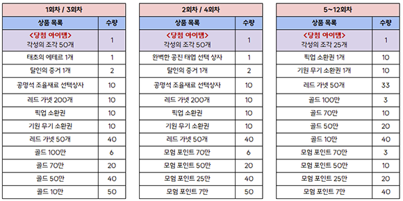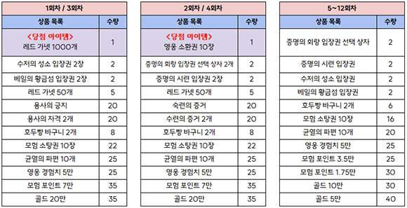 - 경품 추첨은 총 12회차까지 있으며, 회차별로 획득할 수 있는 보상은 다음과 같습니다.