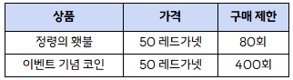 - 이벤트 참여에 필요한 재화 구매가 추가됩니다.