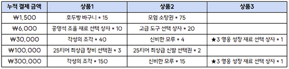 - 이벤트 기간동안 해당 금액만큼 결제 시 아래의 추가 보상을 획득할 수 있습니다.