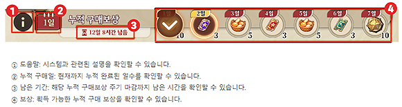 - 1일부터 7일까지 연속 구매 시, 2회차 보상 스케줄로 전환됩니다.