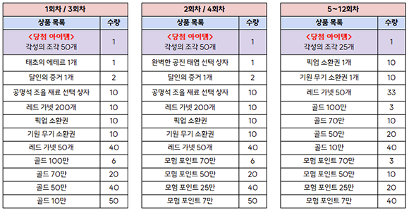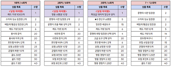 - 경품 추첨은 총 12회차까지 있으며, 회차별로 획득할 수 있는 보상은 다음과 같습니다.