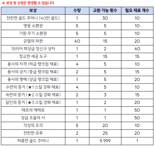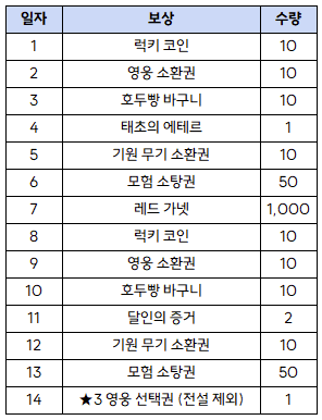 - ★3 영웅 선택권 조각, 찬란한 에테르의 조각, 태초의 에테르, 신비한 모루 등 다양한 보상을 획득할 수 있습니다.