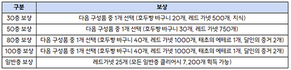 - 보상은 총 30단계로 구성되어 있으며, 정해진 기간동안 미션 달성 시 보상을 획득할 수 있습니다.
