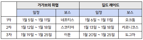 - <가가브의 위협>과 <길드 레이드> 보스가 서로 변경되어 등장합니다.