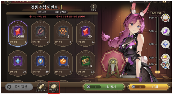 - 진입 방법: 이벤트 → 경품 추첨 이벤트 → 이벤트 기념 상점 (하단)