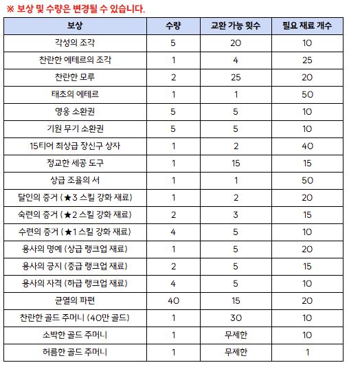 - 그 외 달성 보상 및 시즌 보상이 다음과 같이 상향됩니다.